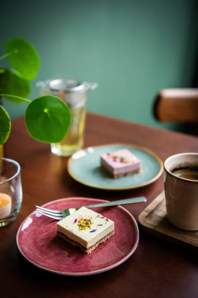 Nienke deelt met ons eenzelfde visie; ze neemt de tijd om smaak en structuur te laten ontstaan, werkt bewust met pure ingrediënten en heeft aandacht voor diëten en intoleranties. We kopen bij haar onze vegan en glutenvrije taartjes in, die trouwens ook door niet-vegans zeer gewaardeerd worden!